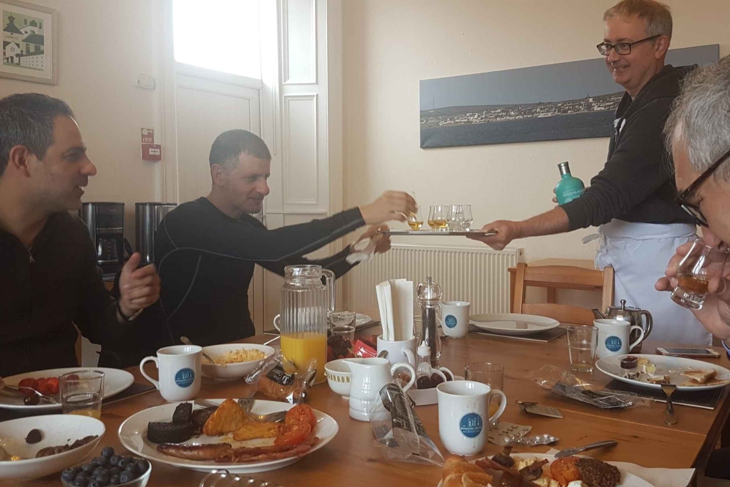 - Indkvartering er på B&B-basis i Bowmore House eller Island Bear. Prisen er baseret på 2/3 personer, der deler et dobbelt-/tredobbeltværelse. Der er et tillæg på £ 300 for enkeltværelse.