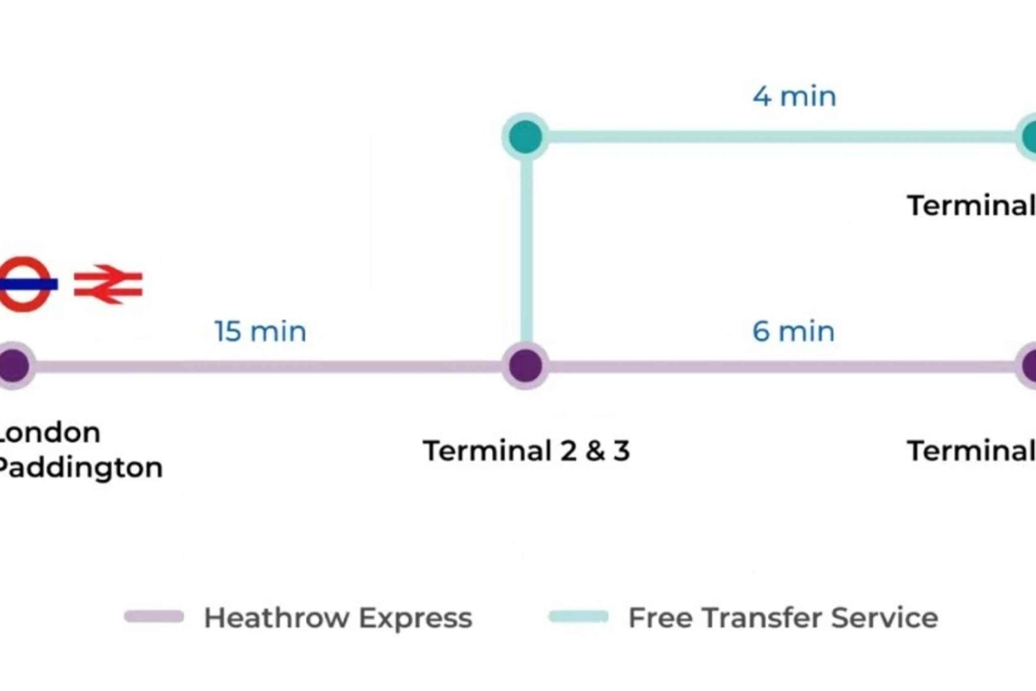 - Betriebszeiten: Heathrow nach Paddington: Mo–Sa 05:12–23:57 Uhr, So 05:17–23:57 Uhr. Paddington nach Heathrow: Mo–Sa 04:34–23:25 Uhr, So 04:55–23:25 Uhr. Bitte beachte, dass sich die Fahrpläne des Heathrow Express ändern können. Die Züge fahren alle 15 Minuten und die Fahrt dauert etwa 15 Minuten. Wenn du am Terminal 2 oder 3 des Flughafens Heathrow ankommst, steig einfach in den Heathrow Express am Heathrow Central ein. Wenn du am Terminal 5 ankommst, fährt dein Heathrow Express-Zug vom Terminal 5 ab. Passagiere, die am Terminal 4 ankommen, müssen einen kurzen Zugtransfer vom Terminal zum Heathrow Central nehmen. Kinder bis 15 Jahre fahren in Begleitung eines zahlenden Erwachsenen oder allein mit einem gültigen Flugticket kostenlos mit. Ein Altersnachweis kann verlangt werden. Das Hin- und Rückfahrticket ist ein offenes Ticket, das innerhalb des Monats, in dem du buchst, gültig ist. Kunden mit einem Hin- und Rückfahrticket sollten das Original aufbewahren, um die Rückfahrt zu garantieren.