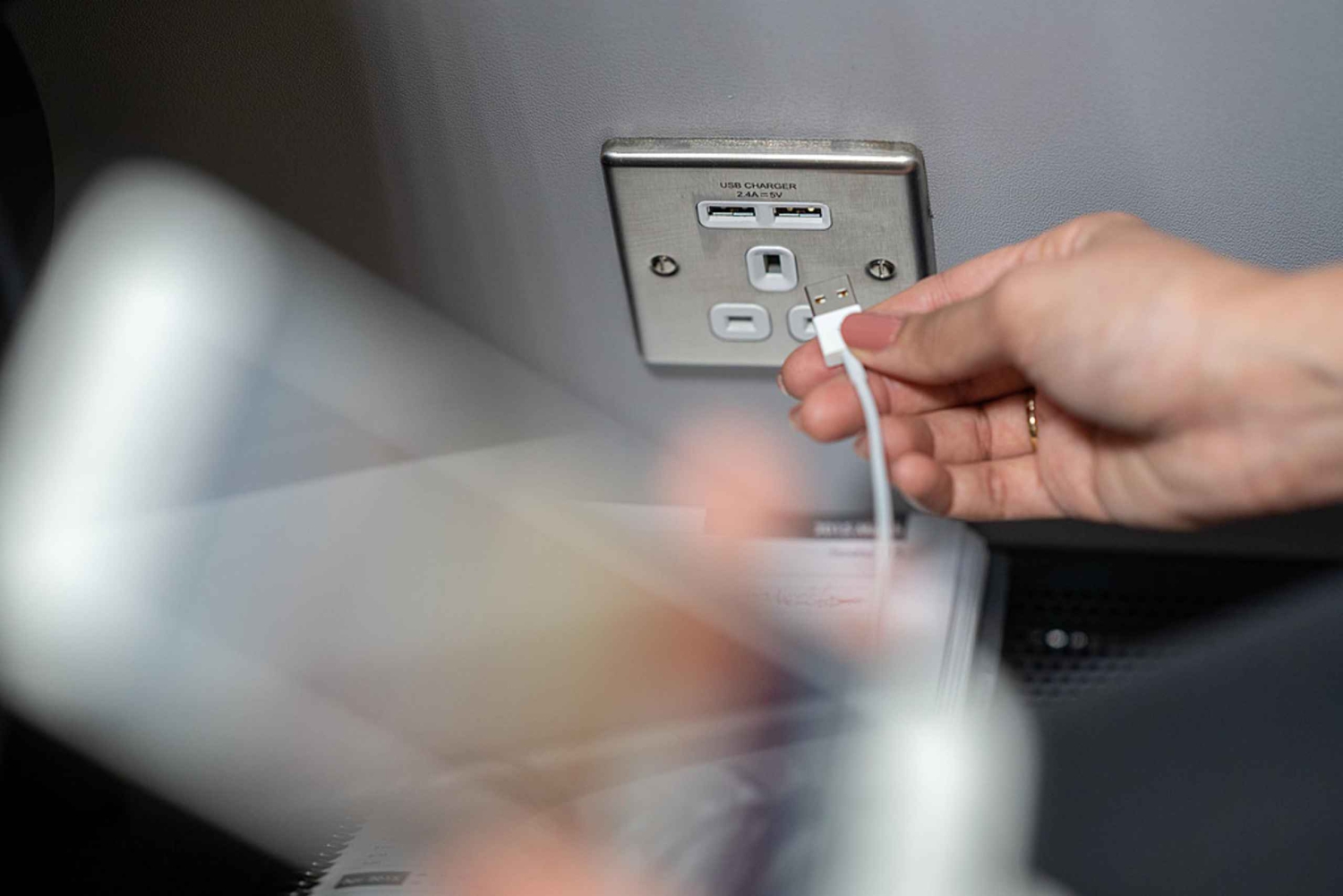 - Lade deine mobilen Geräte an Bord auf, während du zum und vom Flughafen reist