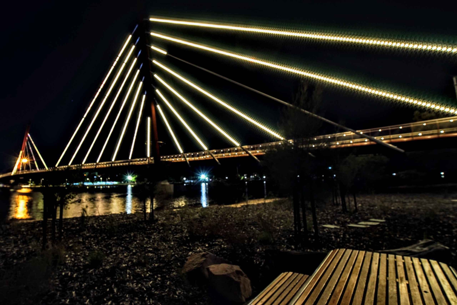 - Mach Fotos vom Perth Stadium und den wechselnden Farben der Matagarup Bridge