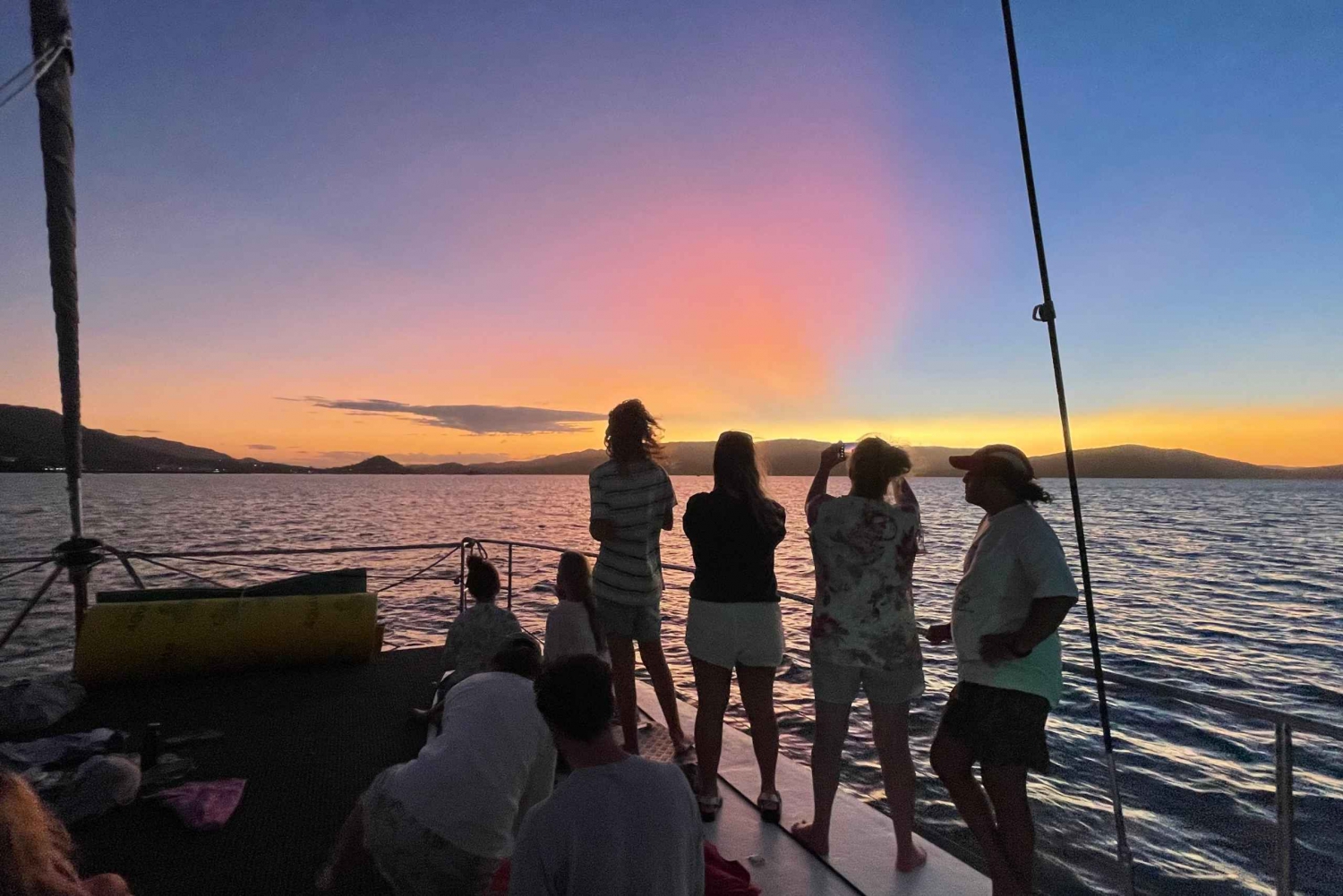 Mientras navegamos de vuelta a Airlie Beach, disfruta de bebidas frías y aperitivos mientras contemplamos una puesta de sol épica. Aventura, buen rollo, buena música y mucha diversión: así son las Whitsundays como nunca las has visto antes.