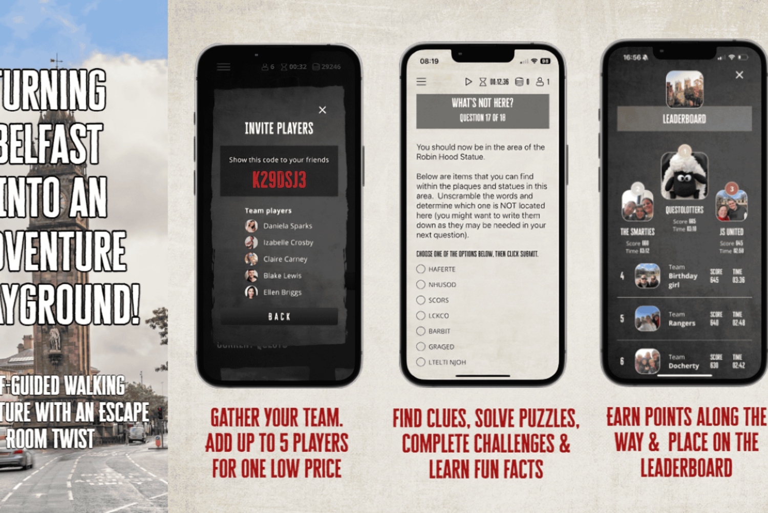 ベルファストの市内中心部の通りを探索し、手がかりを見つけたり、パズルを解いたり、チャレンジを完了したり、途中でポイントを獲得したりして、隠れた道を開きます。すべて Go Quest Adventures アプリでセルフガイドです。地域のハイライトを見て、隠れた名所を探索し、途中で内部の歴史や楽しい事実を学びます (地元の人でも何か新しいものを発見するでしょう)。 クエストはスピリット オブ ベルファストから始まり、大聖堂地区の入り口、ラガン川に沿って進み、ベルファストの歴史的なリネン地区と有名なクラウン バーで終わります。途中で隠れた川を発見し、大義を持った反逆者について学び、英国で最も美しい通りの 1 つと呼ばれる通りを歩き、ベルファストで最も建築的な名所の 1 つを探します。 クエストはセルフガイドなので、次のことができます。 * いつでも好きなときにクエストを開始し、自宅から印刷することなくすぐにアクセスできます * 好きなだけ速く進んでリーダーボードのトップを目指すか、途中で休憩を取りながら自分のペースで進んでください。 * 追随するグループがいないプライベートな体験。1 つの料金で最大 5 人のプレイヤーを追加できます。 船を停泊させ、快適な靴を履いて、名所を探索し、隠れた名所を発見し、最終的にベルファスト クエストを制覇する準備をしましょう。 これは、カップル、家族、友人グループ、学校のグループに最適な屋外アクティビティであり、チーム ビルディングや企業アクティビティにも最適です。 今すぐクエストに参加しましょう。Includes