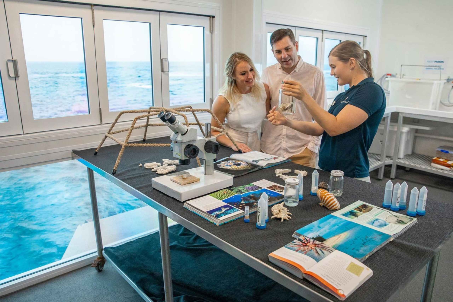 Schilderachtige helikoptervluchten van en naar het ponton Privé VIP-ruimte op het ponton Privétour snorkelen met zeebioloog Ochtendthee, snacks en zeevruchten schotel en buffet menu (zeevruchten schotel kan worden vervangen door vleeswaren - operator moet worden aangemeld) Gratis gekoelde champagne Rondvaart met glazen bodem en VIP boarding Privétour door het wetenschapslaboratorium onder leiding van de zeebioloog Toegang tot de kleedkamerEasy cancellation