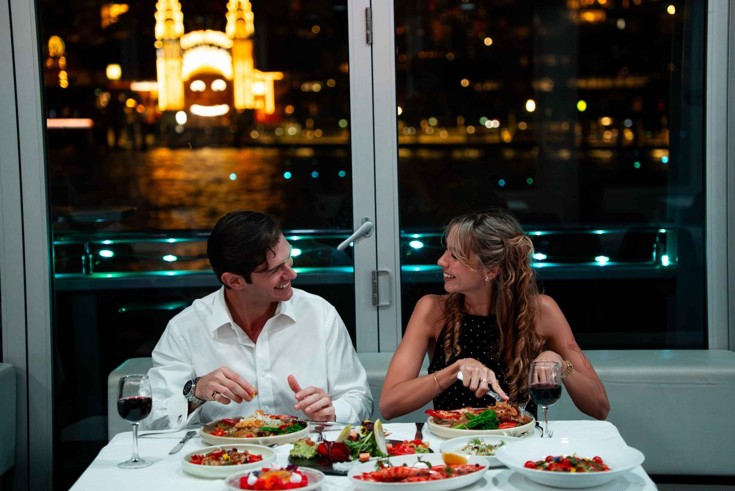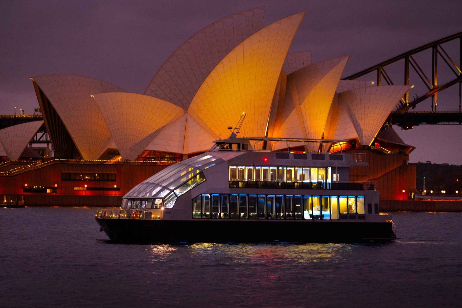 - Klädkoden är smart casual. Checka in på King Street Wharf 5 (tiderna är 19:00 ombordstigning, 19:15 avgång, 22:00 retur). Vegetariska måltider finns tillgängliga. Dryckesservicen börjar vid ombordstigningen och slutar 15 minuter före kryssningens slut.