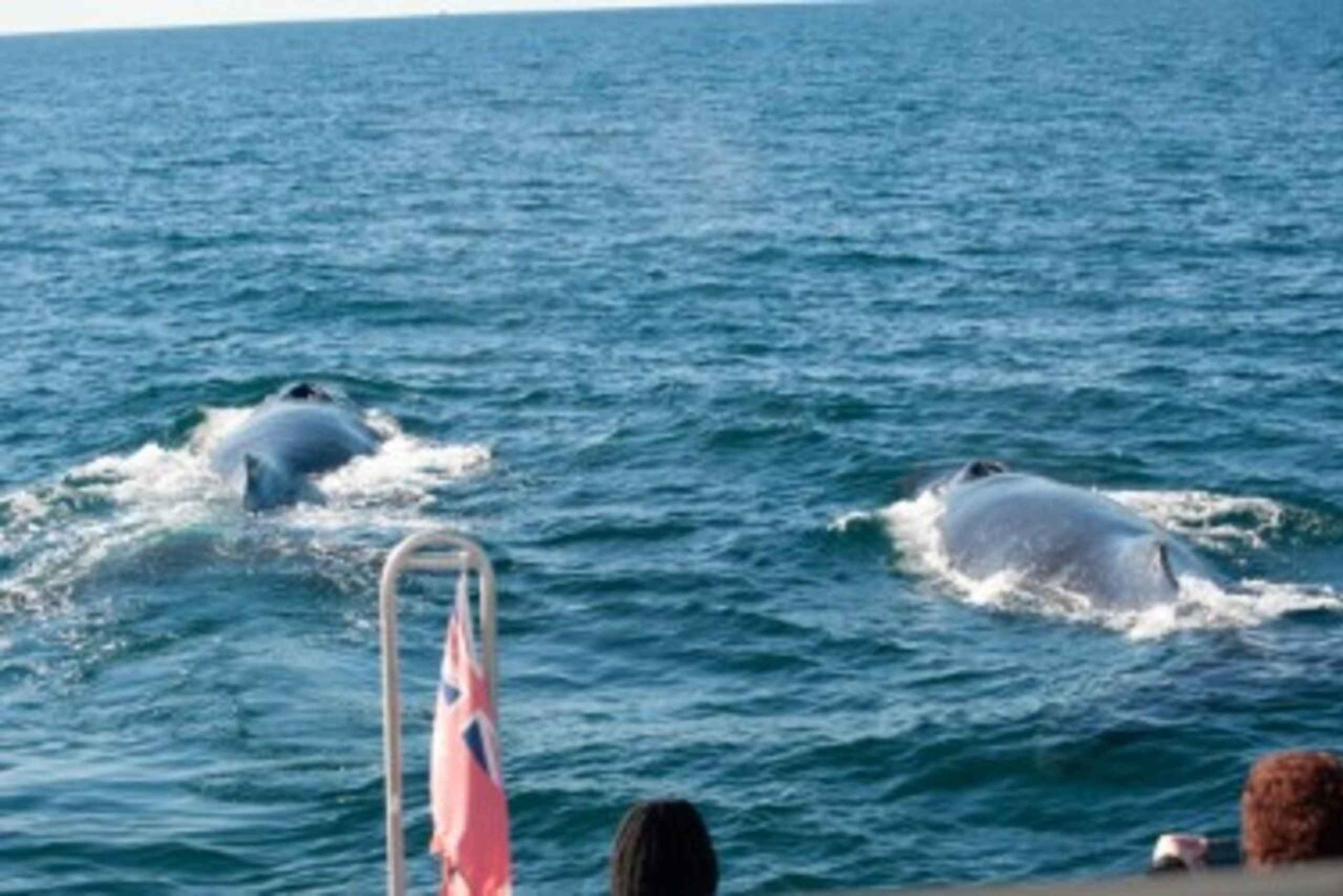 - Njut av antingen en varm frukost eller en BBQ-lunch, beroende på vilket alternativ du väljer, medan du kryssar nerför hamnen på väg för att se valarna
