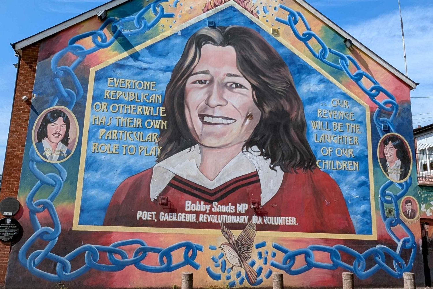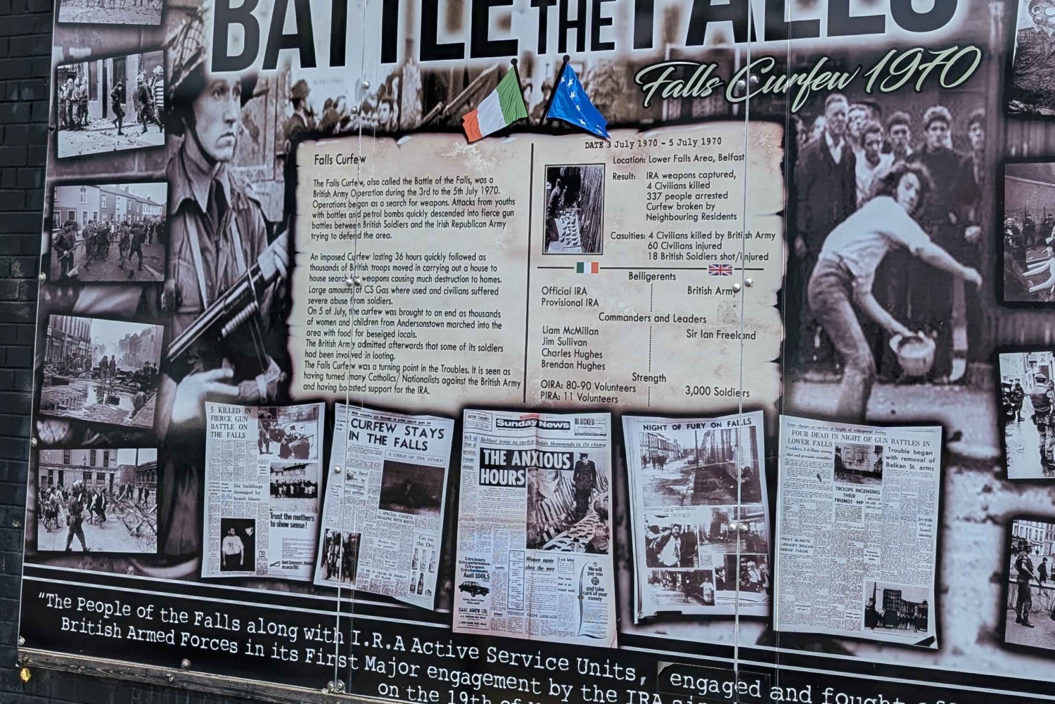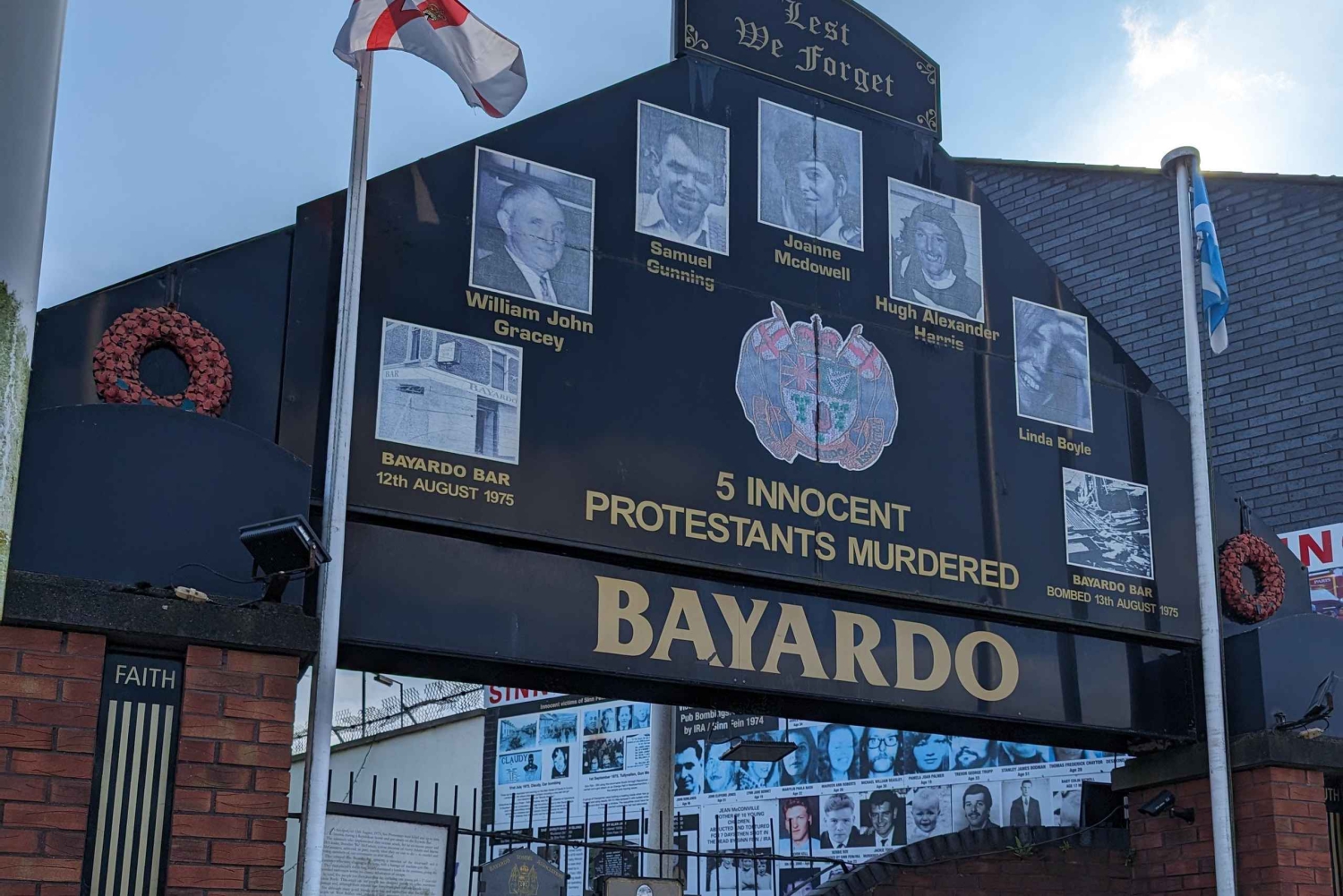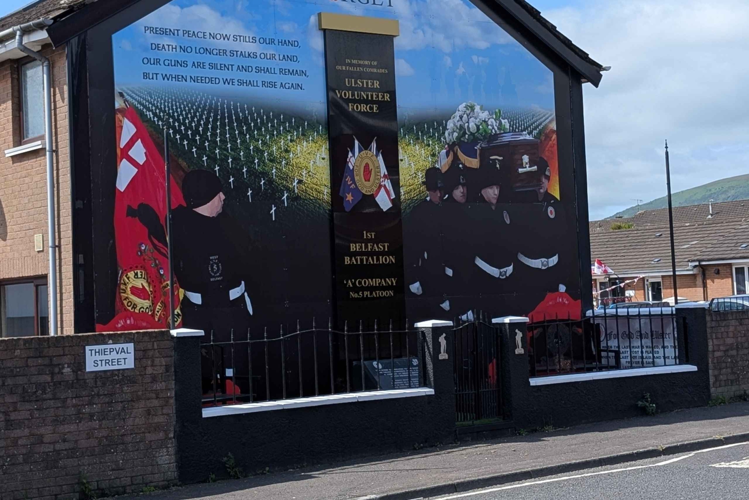 Turen börjar vid Divis Tower, där upploppen började, och fortsätter sedan längs International Wall och Northumberland Street, Falls Road, där du får höra om hungerstrejkarna och livet under konflikten. Besök Clonard Monastery, där de första fredssamtalen ägde rum, och minnesmärkena på Bombay Street. Korsa Gates of the Peace Line och gå längs Peace Wall, där du kan föreviga dig själv med ett meddelande. Upplev Shankill Road där du passerar väggmålningar och minnesmärken och lär dig om historien och den inverkan som Belfasts svåra förflutna har haft på samhällena. Rundvandringen avslutas nära Divis Tower.Includes